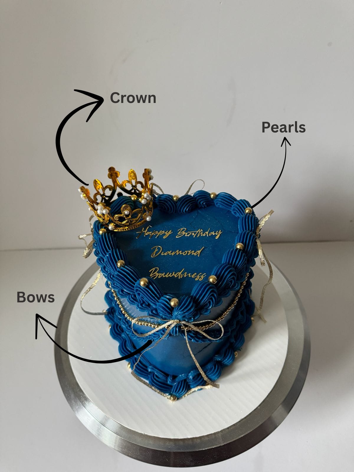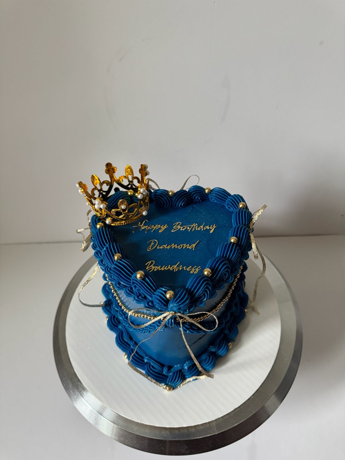 Make them feel like absolute royalty with this luxurious heart-shaped Royal Crown Cake. Designed with deep navy blue buttercream, ornate gold pearls, elegant piping, and shimmering gold bows, it’s crowned—literally—with a regal golden topper. Perfect for queens, divas, or anyone who deserves the royal treatment on their special day.