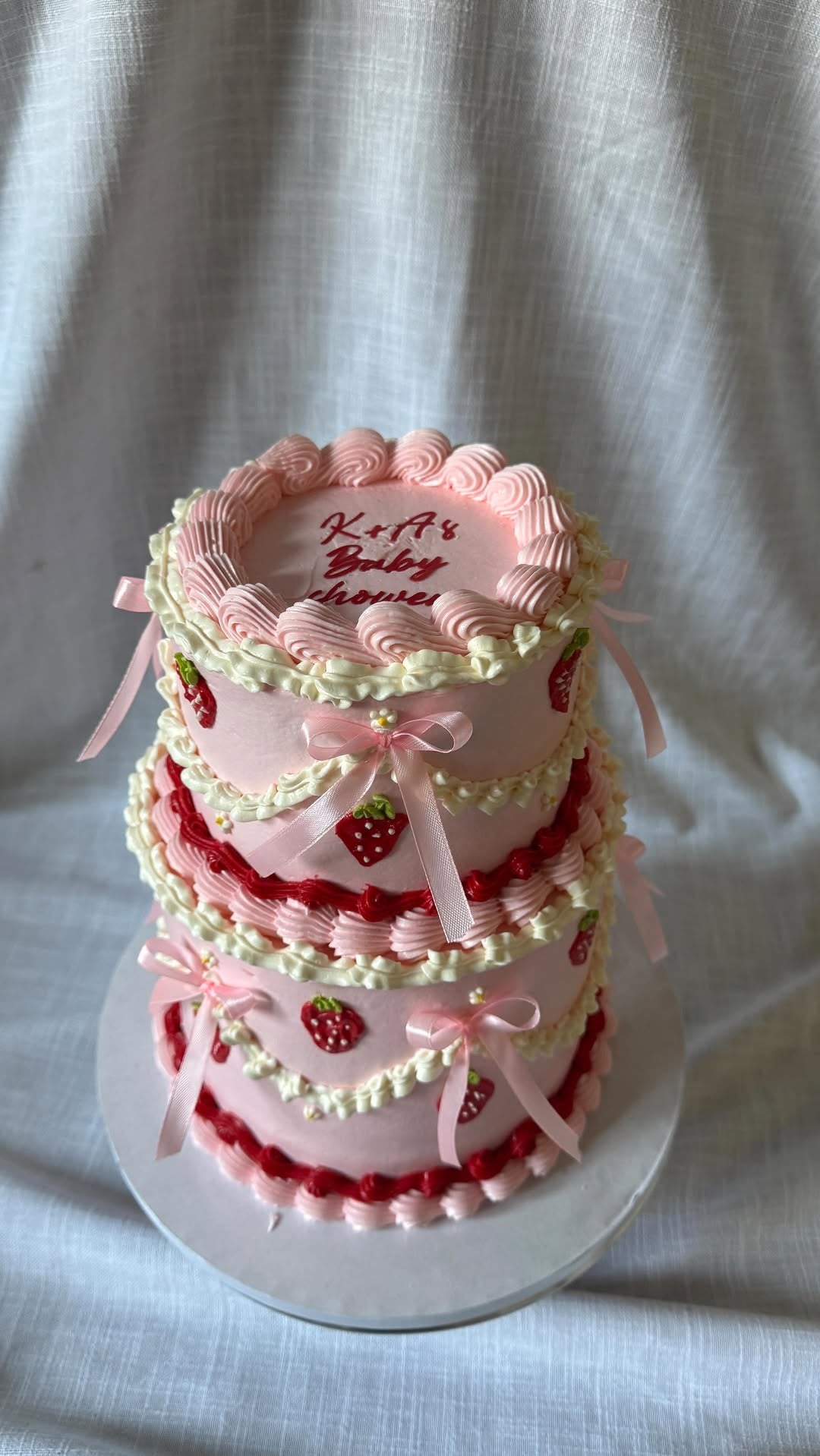 Bring sweetness and style to your celebration with our Strawberry Layered Celebration Cake – Decorated with soft pink buttercream, vintage-style piping, delicate pink bows, and hand-piped strawberries, this cake is perfect for baby showers, birthdays, bridal parties, or any moment worth celebrating in style.