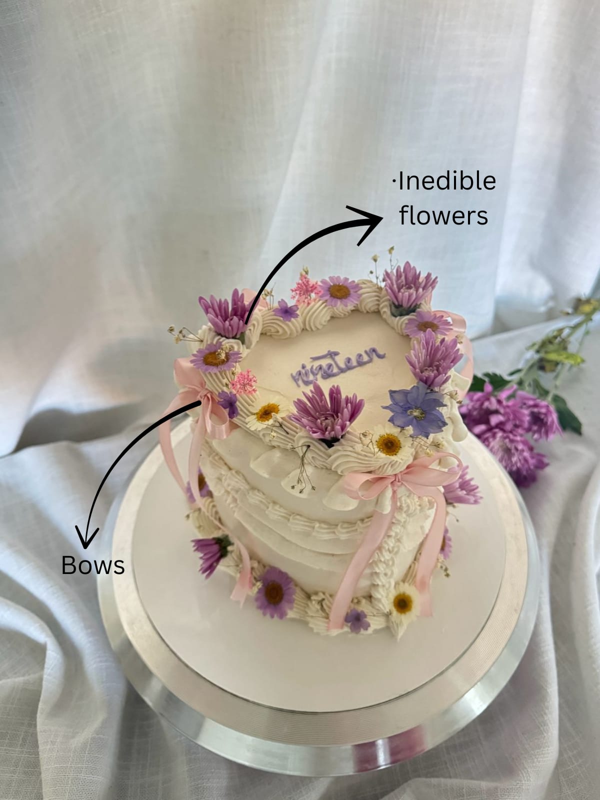 The Lilac Love Cake is decorated with bows and flowers, perfect for your celebrations.